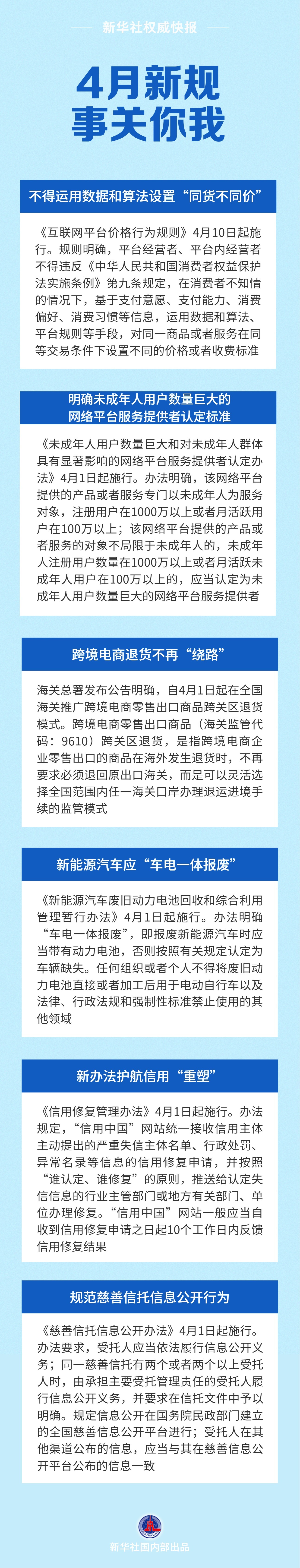不得运用数据和算法设置“同货不同价”;明确未成年人用户数量巨大的网络平台服务提供者认定标准;跨境电商退货不再“绕路”……4月新规,事关你我,一起来看。