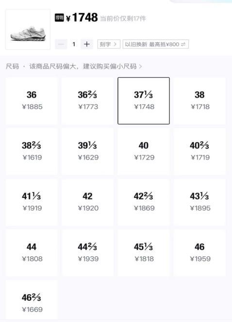 最终,方蕾选择在得物购入第一双萨洛蒙。“这款的发售价是1398元,我当时花了1699元。”为了喜欢的颜色,她觉得支付一点溢价是可以接受的。何况,不到一年,这款鞋又涨价到了1748元。一些更热门的款式和配色,在得物上甚至可以炒到3000元以上。